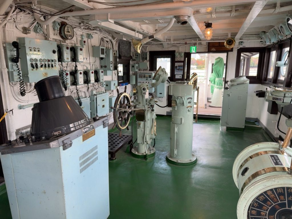 操舵室にも入れます。計器はレトロな感じそのものですが今でも動かせるんじゃないかなくらい綺麗に保管されてます。