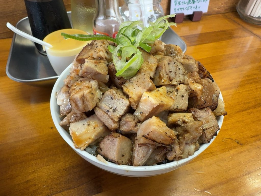 ミニ炙りチャーシュー丼。400円。器はお茶碗サイズですがご飯が日本昔話盛りな上、チャーシューもてんこ盛りです。結果若干食べにくいですが個人的にはラーメンより好きです。かなり美味いのでオススメ。