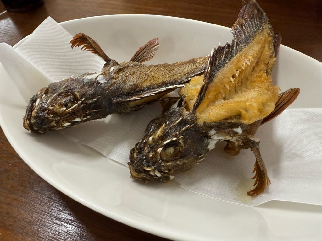 今回釣ったイサキとカサゴのうち、カサゴを唐揚げにしてもらいました。カサゴの唐揚げはフツーにうまいです。特にヒレのカリカリが好き。ロックフィッシュ系は油との相性良いですよね。