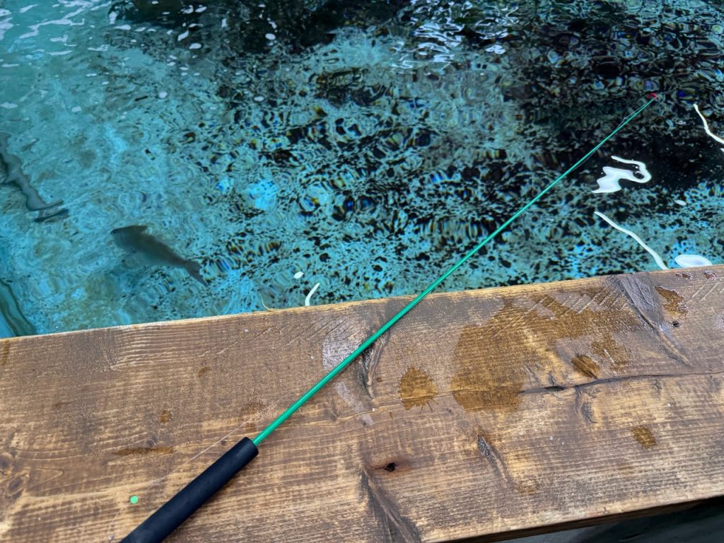 仕掛けはこんな感じ。延べ竿にビーズと針が付いてるだけのシンプルな仕掛け。入場料に竿代も混みです。エビ付けて投入。足元に台も置いてあるのでちびっ子にも優しいです。