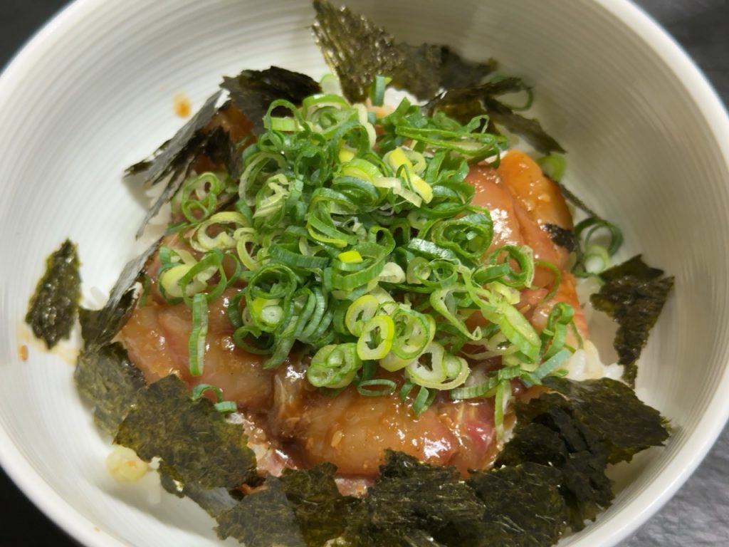 軽く漬け込んでご飯にのせたらイサキのゴマだれ丼です。歯応えコリコリの美味しいどんぶり完成。
