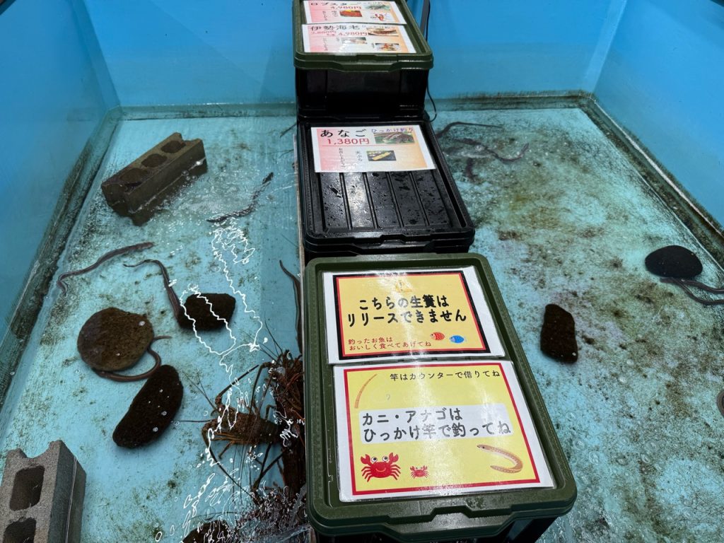 伊勢エビ、アナゴ、ロブスターは引っ掛け釣りなんですがリリース禁止なため伊勢エビやロブスターを不用意に引っ掛けると1匹で5000円ほど飛びます。翌月お父さんの小遣いが減らされそう。ロブスターはかなり良いサイズでした。